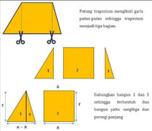 - Contoh: Memecah trapezium menjadi dua segitiga dan satu persegi panjang.