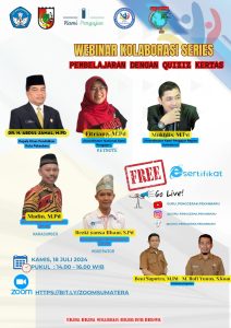 Komunitas Kami Pengajar, Komunitas Guru Penggerak Kota Pekanbaru, dan Komunitas Gelirya dengan bangga mempersembahkan sebuah webinar kolaborasi yang menarik dan inspiratif dengan tema: “Quiziz Kertas dalam Pembelajaran”, sebuah kesempatan berharga bagi guru untuk mempelajari dan menerapkan metode pembelajaran inovatif yang dapat meningkatkan efektivitas dan kesenangan dalam proses belajar mengajar, memperkaya pengalaman siswa, dan berinteraksi dengan sesama pendidik untuk berbagi pengalaman serta menemukan solusi bersama untuk tantangan pembelajaran sehari-hari, sehingga bersama-sama kita dapat menciptakan lingkungan pendidikan yang lebih baik bagi generasi mendatang.