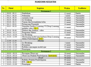 Narasumber diajak untuk memahami urgensi dan relevansi Deep Learning dalam dunia pendidikan, sehingga mereka dapat menyusun modul dan materi yang sesuai dengan kebutuhan guru dan siswa. Selain itu, mereka juga merancang susunan kegiatan pelatihan yang sistematis, mencakup pemaparan teori, diskusi interaktif, serta praktik langsung dalam penerapan Deep Learning di kelas. Dengan demikian, pelatihan ini diharapkan dapat memberikan pemahaman yang mendalam dan aplikatif bagi para peserta