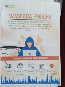 Phising merupakan salah satu bentuk kejahatan digital yang sering terjadi di internet. Poster “Waspada Phising” menjelaskan bahwa pelaku phising biasanya menyamar sebagai pihak resmi atau terpercaya untuk mencuri informasi penting, seperti username, password, nomor kartu kredit, atau data pribadi lainnya. Cara kerja phising sering kali dimulai dari tautan atau pesan yang terlihat meyakinkan, kemudian mengarahkan korban ke situs palsu yang menyerupai situs resmi.